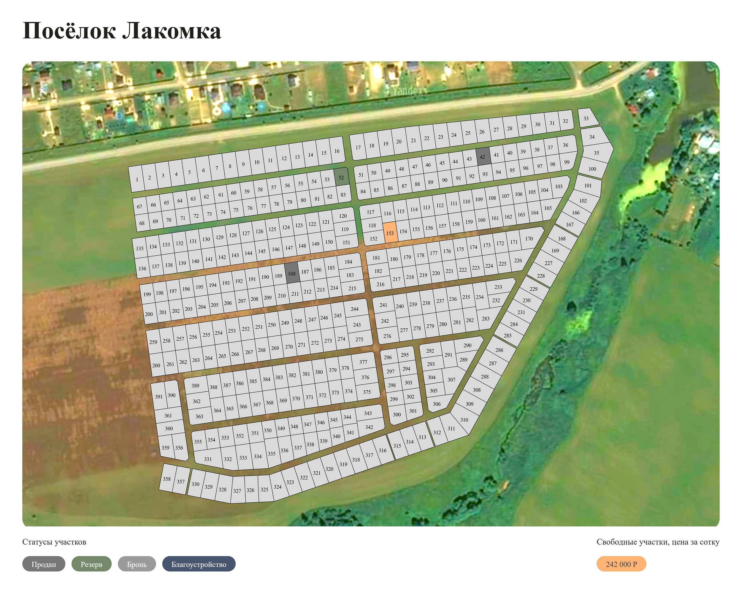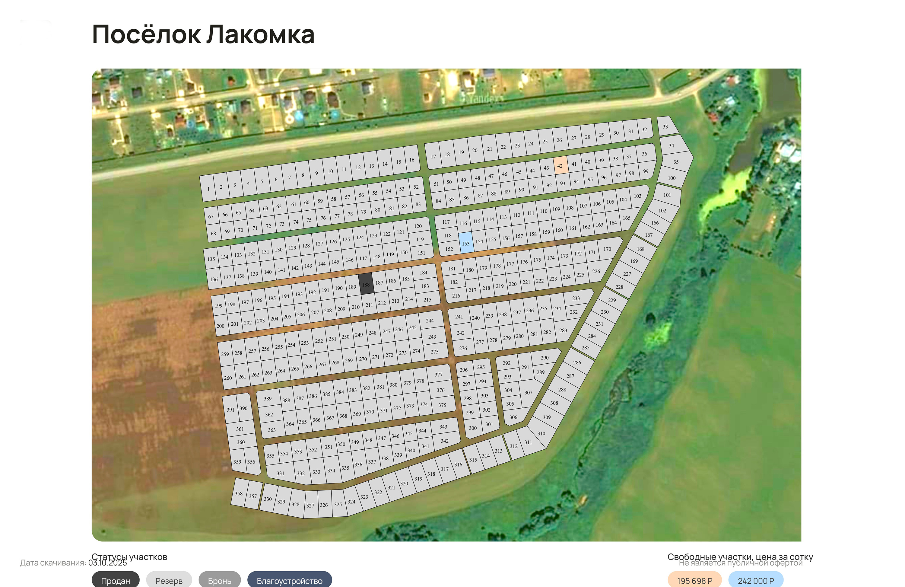 Поселок Лакомка находится в 3 км от озера Черного, рядом с живописной лесной зоной. На берегу есть беседки, столики, скамейки, волейбольная площадка, мостки для рыбалки. На каждый участок выделено 15 кВт электричества, внутри поселка построены дороги из асфальтной крошки. Есть возможность подключиться к магистральному газу. В 50 м от въезда находится продуктовый магазин.